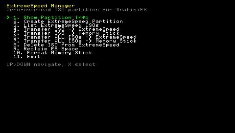 On to the big one – DratiniFS with ExtremeSpeed. A full replacement for Sony’s built in filesystem that supports a minimal FAT32 call set, full spec exFAT format support, and the new PSP ISO specific ExtremeSpeed (ES) RAW partition that is quite literally, extremely fast.