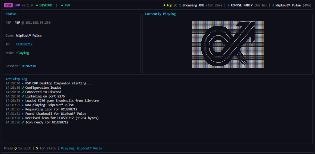 PSP DRP is a custom homebrew plugin and companion desktop app for the PSP that stores and serves current game / app data as Discord Rich Presence (a feature in Discord that shows others what you’re playing).